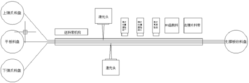 工藝流程:上彈爪料盤→平板料盤→下彈爪料盤→上焊接激光→下焊接激光→彈片位置度CCD→彈片位置度CCD二→彈片彈高→NG取料→去彈片料帶→收料帶